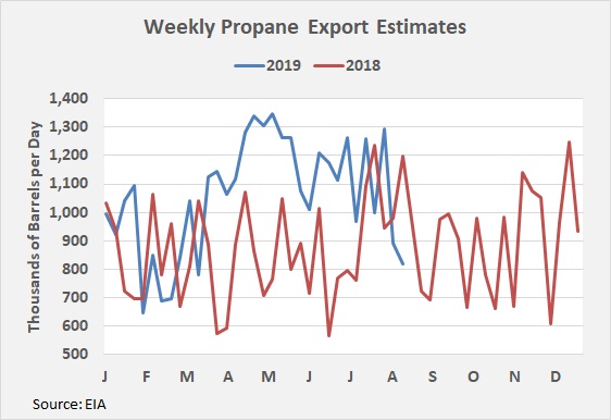 Over the past two weeks, U.S. exports averaged just 855,500 bpd compared to a 1.071 million-barrel average in 2019 prior to those two weeks. Export economics have been unfavorable, and China is no longer taking U.S. propane. China has turned to the Middle East for its supply, as it continues its trade war with the United States. U.S. propane is having to backfill into other markets.