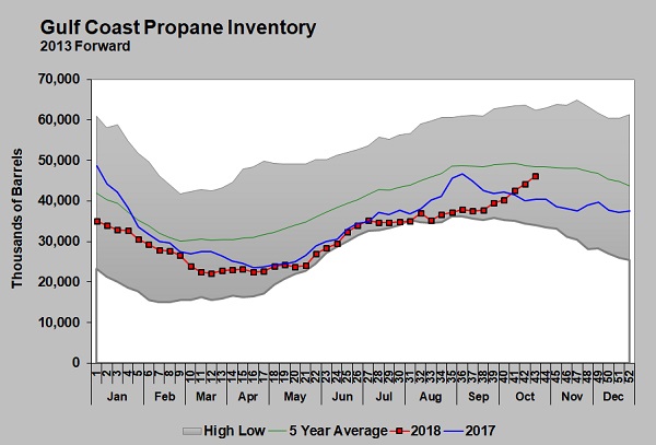 Falling crude prices have been the key reason propane prices have fallen since the beginning of October; however, the rise in Gulf Coast inventory is contributing to propane becoming weaker than crude over this period. Mont Belvieu propane reached 110.25 cents on Oct. 1. Since then, it is down 35 cents, or 32 percent. Since Oct. 1, West Texas Intermediate crude, the U.S. benchmark crude, is down $14.63 per barrel, or 19 percent.
