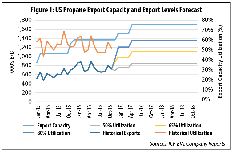The imbalance between exports and export capacity is expected to increase. Due to low oil and gas prices and reduced drilling levels, North American propane production has been flat for much of the past year. While propane production is expected to rebound as oil and natural gas prices start to increase in 2017, with significant long-term growth potential in the northeastern U.S. and the Permian Basin (Figure 2), export capacity and utilization levels are also projected to continue to increase.