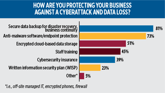 Fewer (39 percent) invest in cybersecurity insurance, which mitigates losses from data breaches, business interruption and network damage, among other problems.